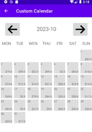 override fun onCreate(savedInstanceState: Bundle?) { super.onCreate(savedInstanceState) binding = CalendarLayoutBinding.inflate(layoutInflater) setContentView(binding.root) calendarAdapter = CalendarAdapter(baseContext, mutableListOf()) updateMonth() title = "Custom Calendar" supportActionBar?.apply { setDisplayHomeAsUpEnabled(true) } binding.btnPrevDate.setOnClickListener { currentDate.add(Calendar.MONTH, -1) updateMonth() } binding.btnNextDate.setOnClickListener { currentDate.add(Calendar.MONTH, 1) updateMonth() } binding.customCalendarDays.apply { adapter = calendarAdapter } } -