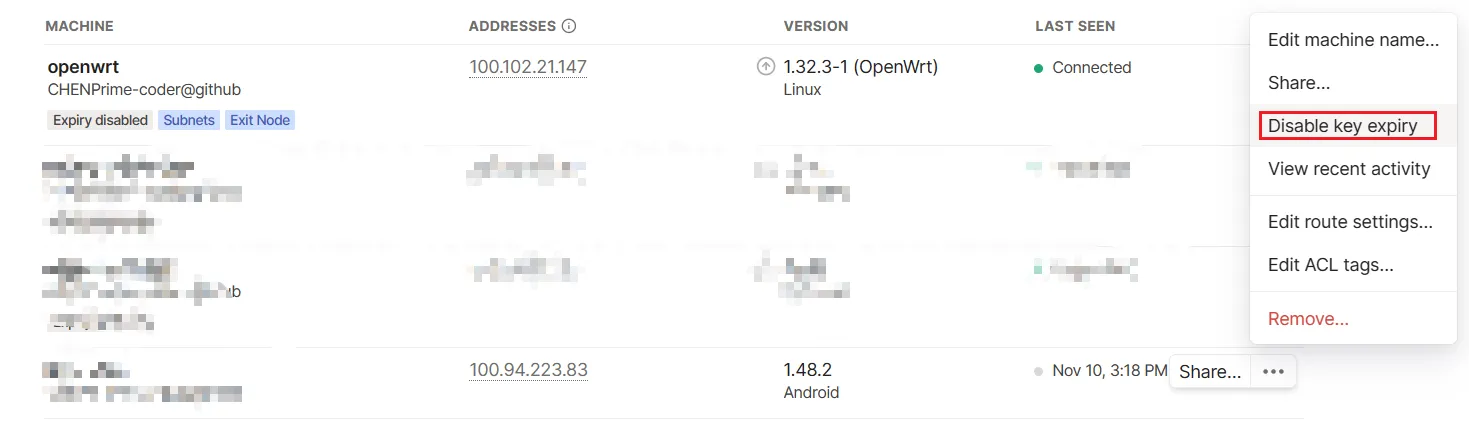 --netfilter-mode自己管理防火墙--advertise-routes=192.168.1.0/24,10.200.2.0/24启用子网,这些子网配置正常就可以在整个Tailscale网络中访问--accept-routes启用路由--advertise-exit-node配置为Tailscale网络的可选流量出口节点--reset如果需要更新之前的配置就需要带上这个参数