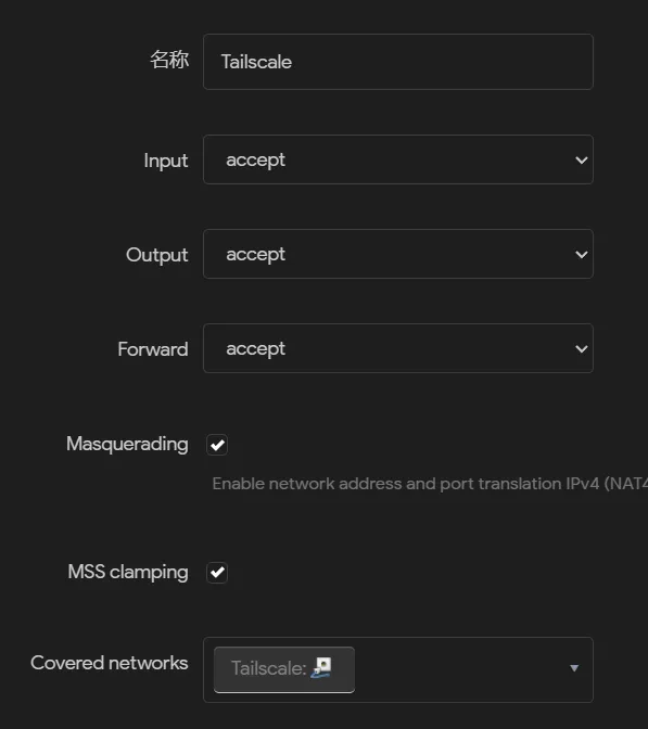 tailscale0,协议选择不配置协议,名称随意 - 在刚创建的接口中配置防火墙,创建(自定义)一个名为