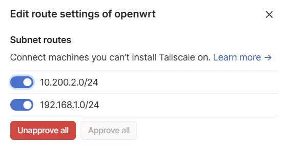 tailscale up --netfilter-mode=off --advertise-routes=192.168.1.0/24,10.200.2.0/24 --accept-routes --advertise-exit-node --reset