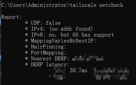 保存后,进入客户端的命令行界面输入tailscale netcheck查看当前DERP服务器信息,如果出现了你配置的服务器,并且延迟正常,就说明成功了!